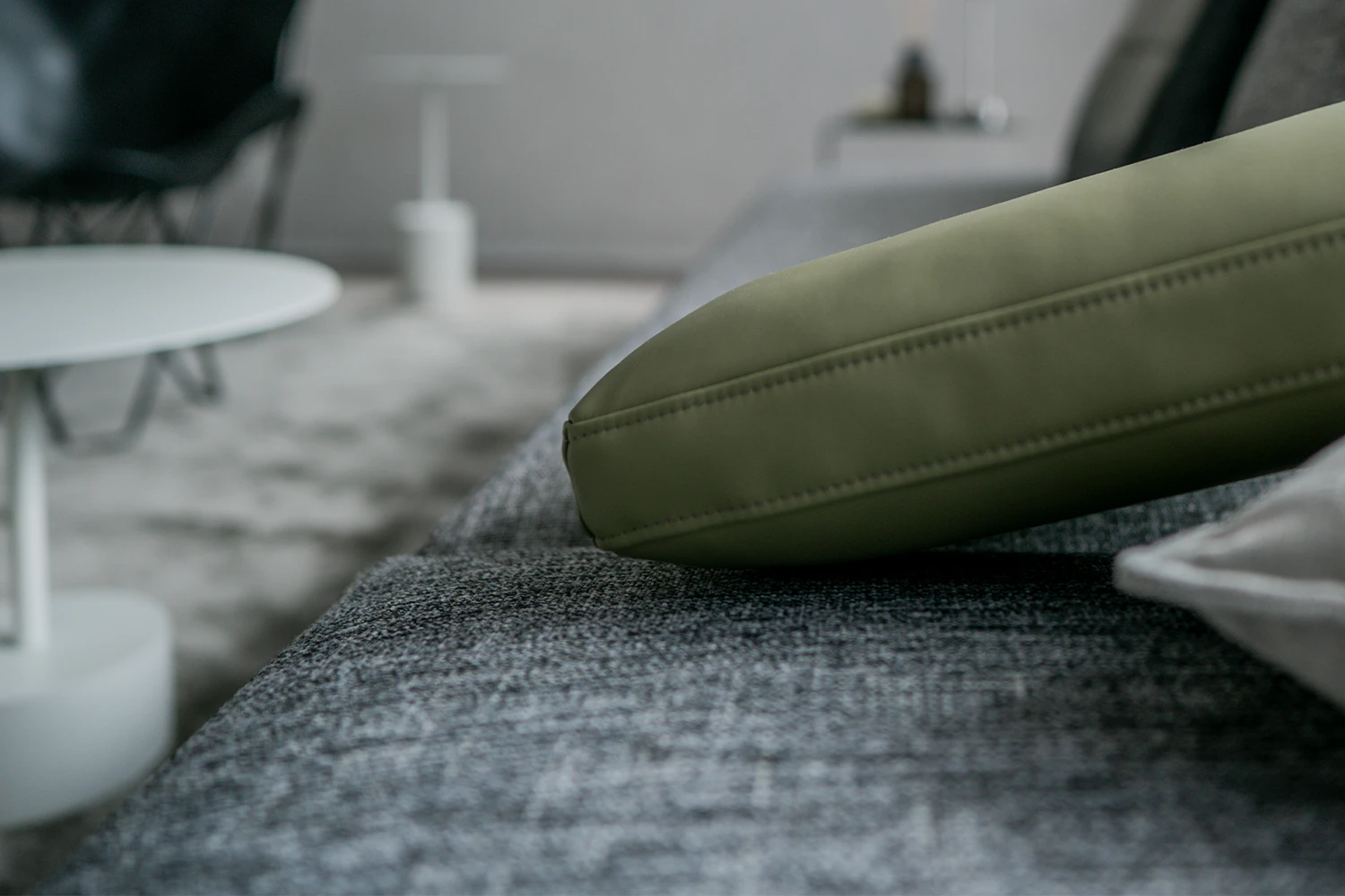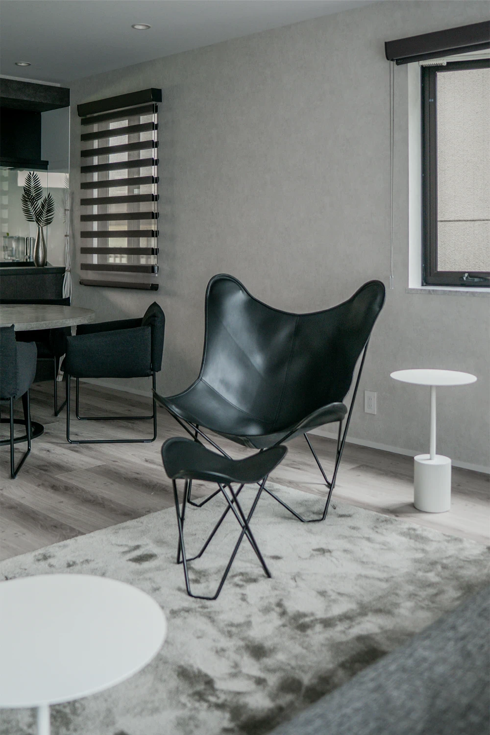 窓前にソファを配置することで、ダイニングやキッチンに対してオープンな印象に仕上がりました。 ソファに沿わせたスツールは、ソファ自体をロングに見せること、ロングに見えても窓への抜けを確保すること、移動させて脚置きやテーブルなどとしても活用できること、と、さまざまな役割を担っています。