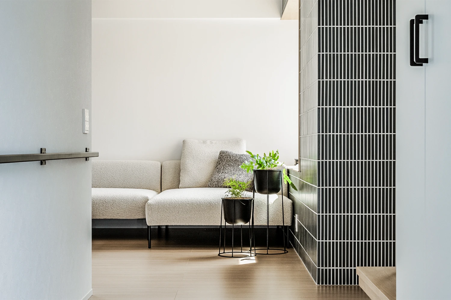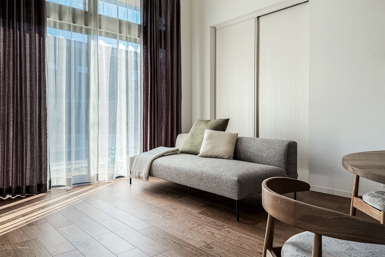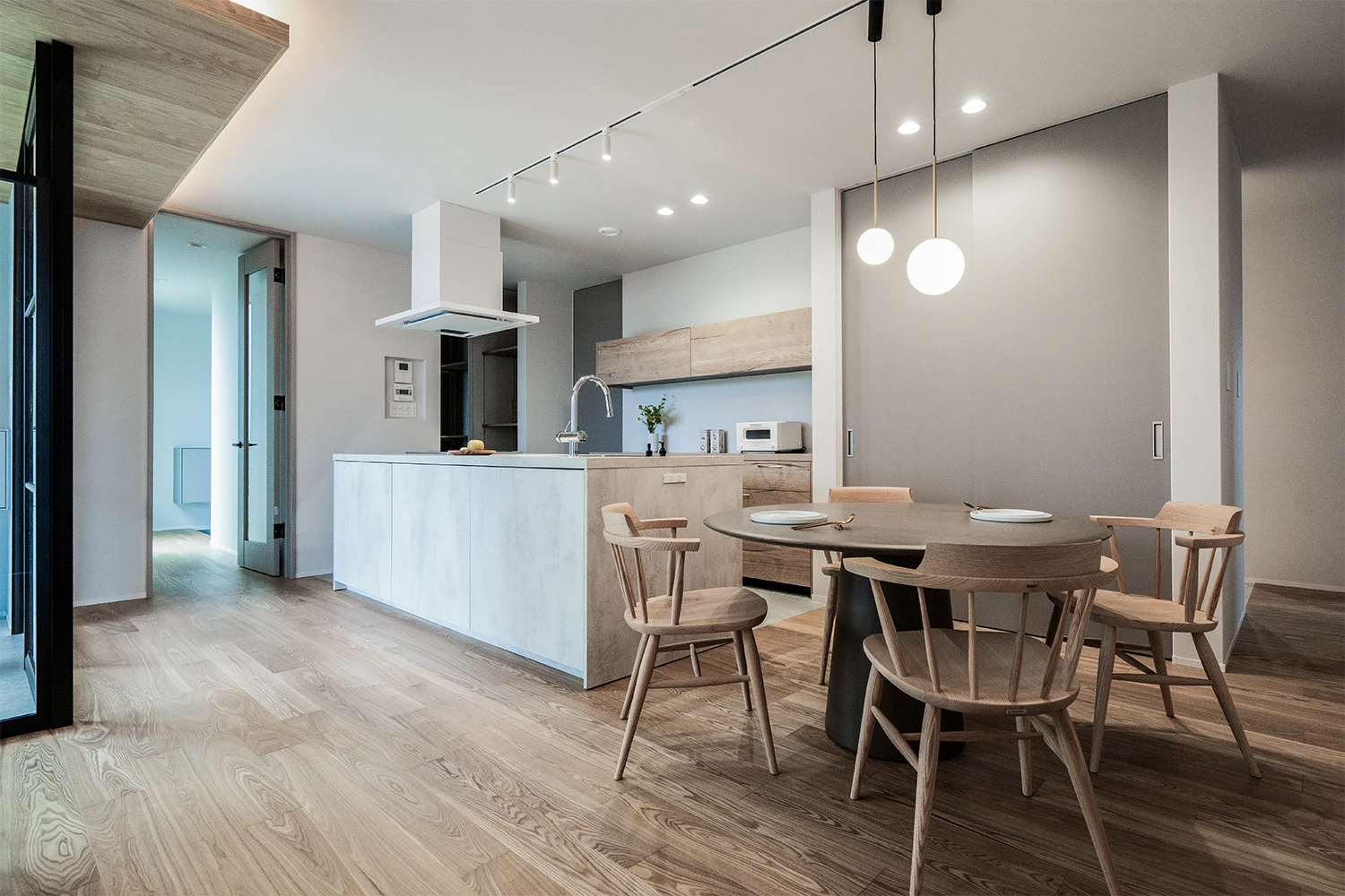 1階から2階へ上がると、まずは壁一面の窓から尾道の街並みが見えてきます。 そして、左にダイニングスペース、右にリビングスペースが配置されています。 リビングでくつろぐのはもちろんですが、ダイニングでもリビングのようにくつろげる家具をご提案しました。 ポイントは、チェアのデザインやサイズと、68cmというダイニングテーブルの「低さ」でした。