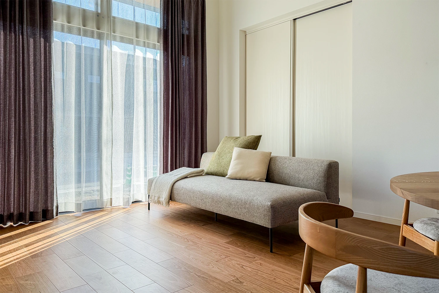 ①ソファ「Marco」は直線的で重心の低いデザイン。壁面のシンプルな仕上げや大きな窓からの光と調和し、空間全体に広がりを感じさせてくれます。テレビはソファの背面に設置予定。