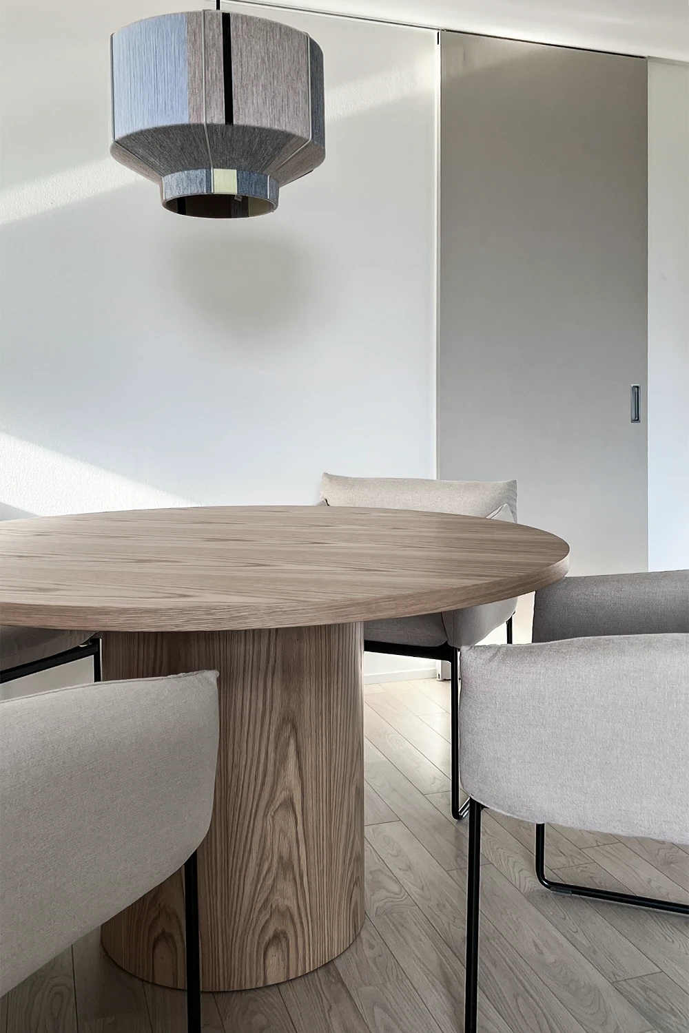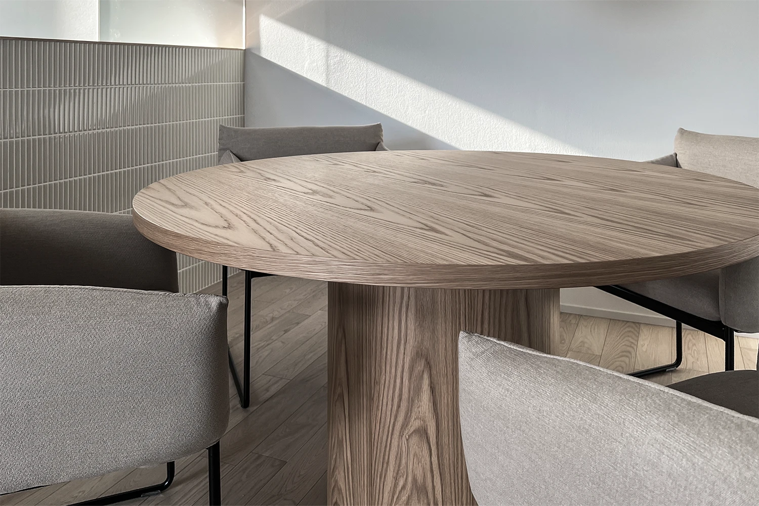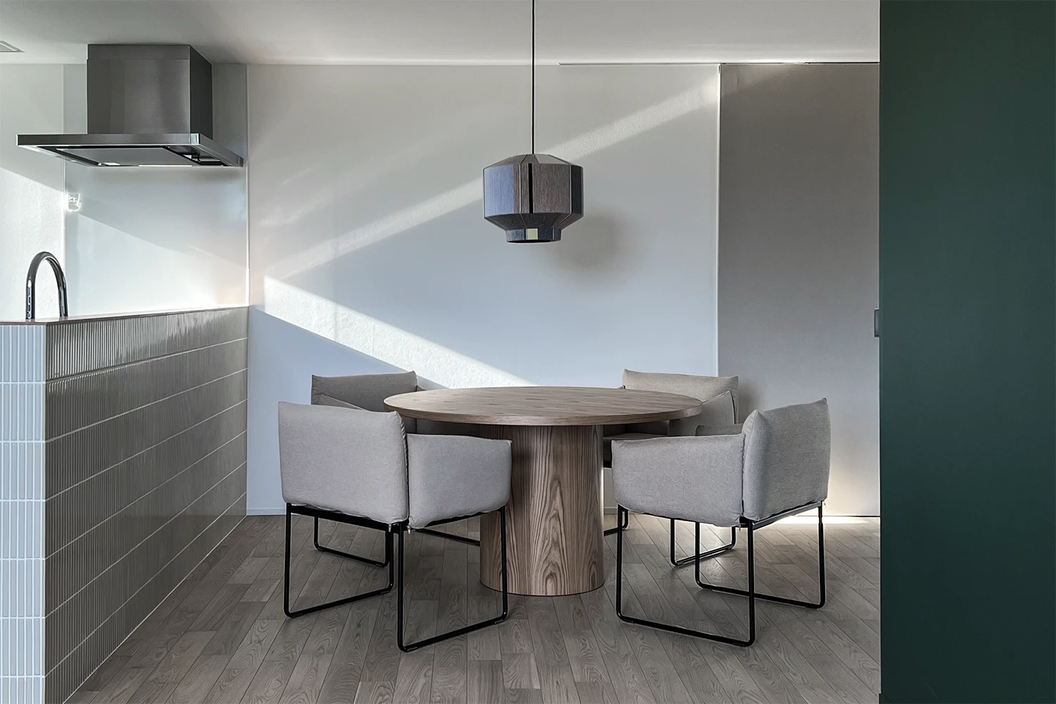 ②1本脚のダイニングテーブルは、ボリュームのあるアーム付きチェアを合わせても、立ち座りをスムーズにしてくれます。 ダイニングスペース全体に回遊性も生まれました。