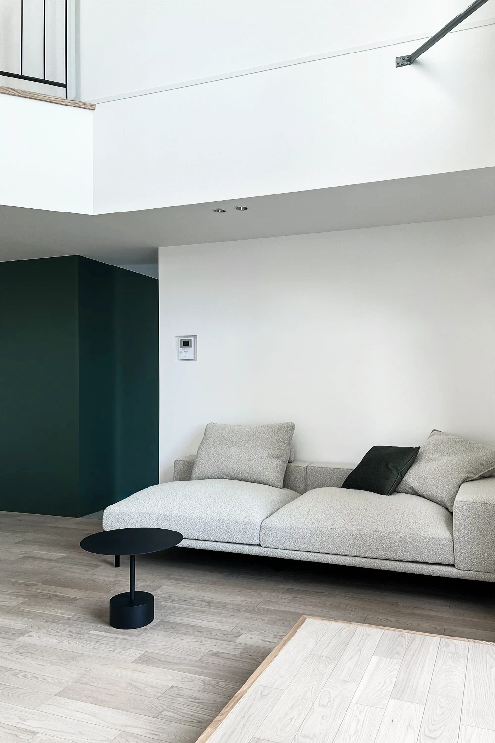 ①ソファは空間に合わせて奥行きが深くボリュームのあるモデルを採用。壁の色とリンクするディープグリーンのクッションで一体感も演出しました。
