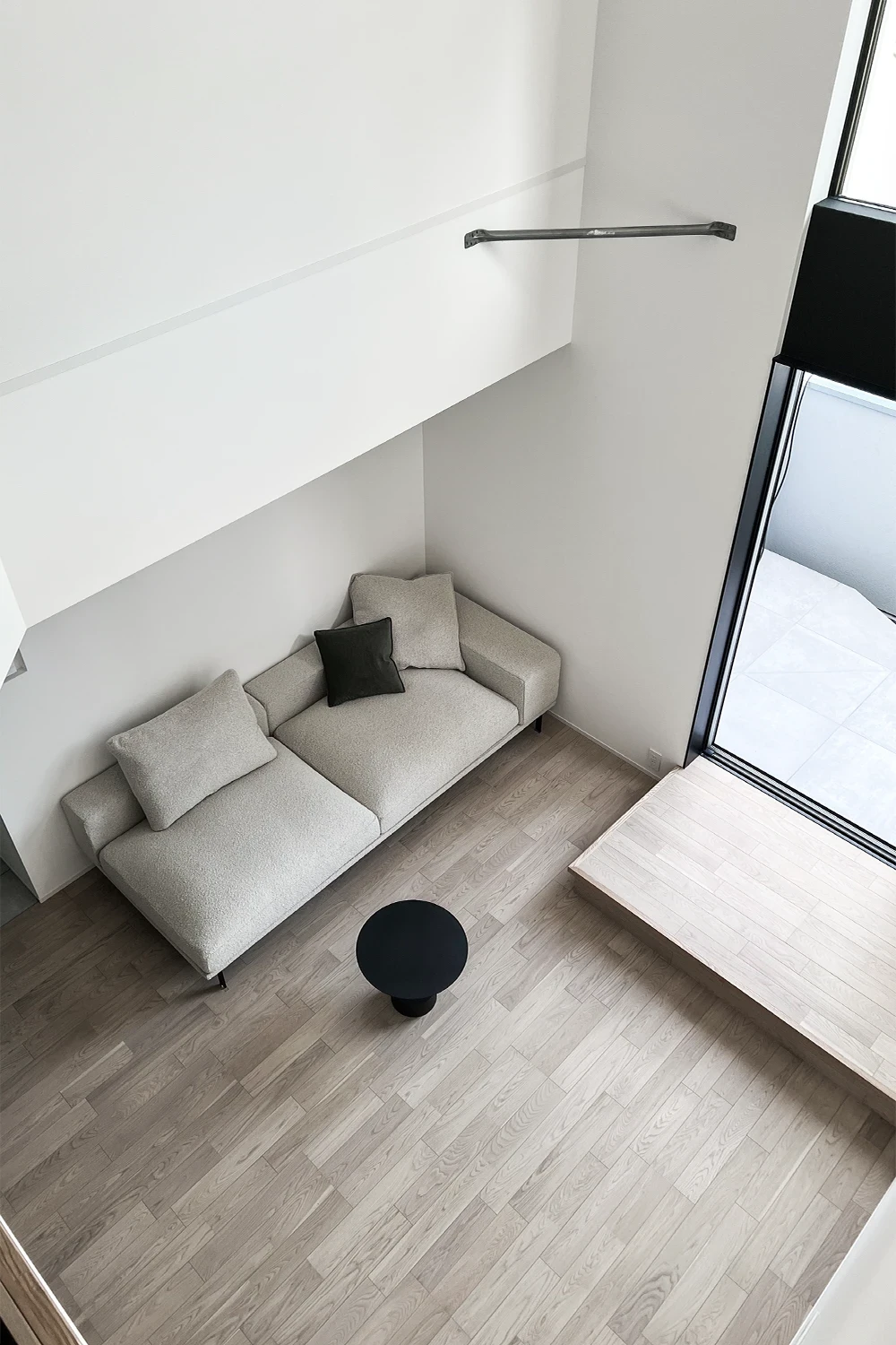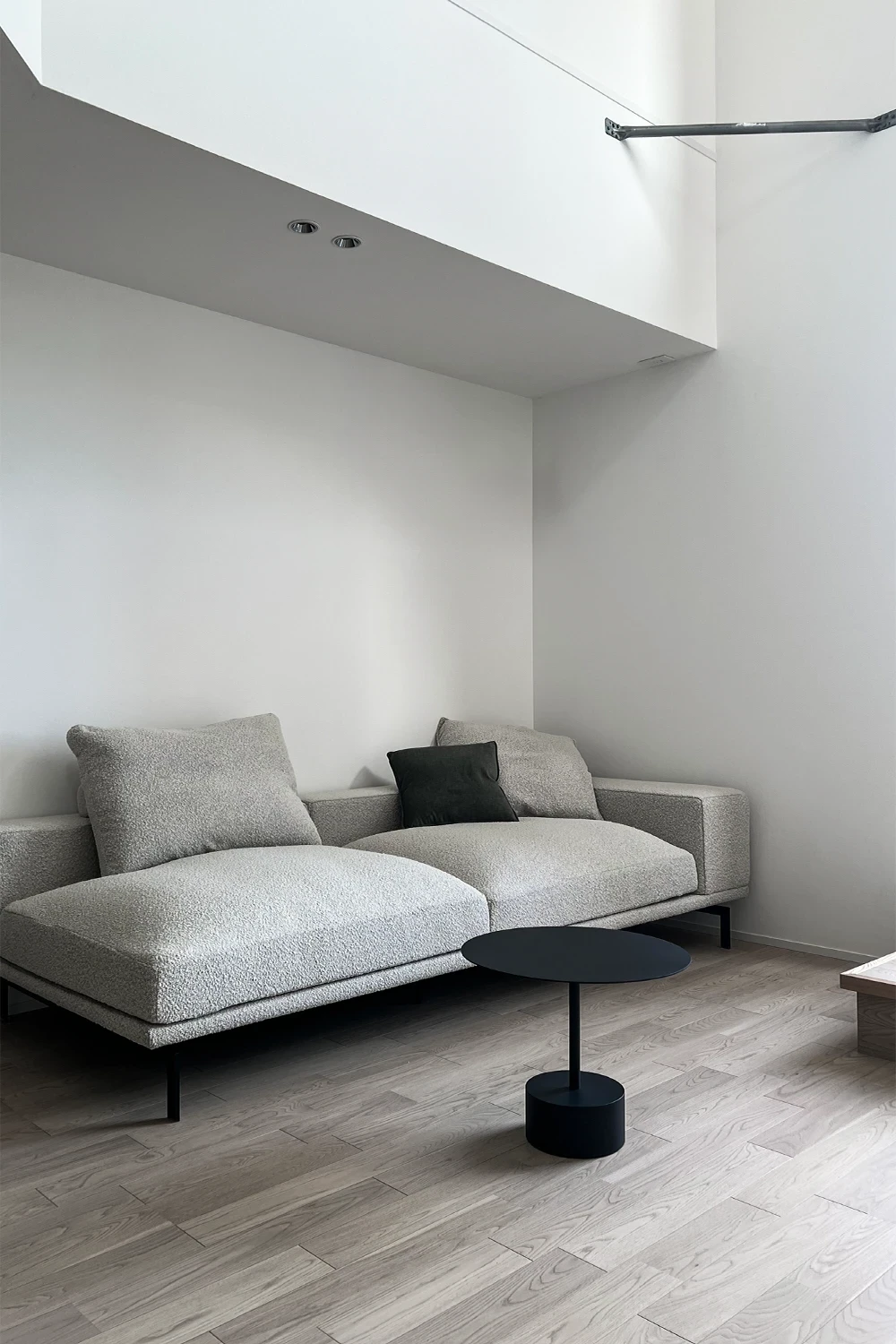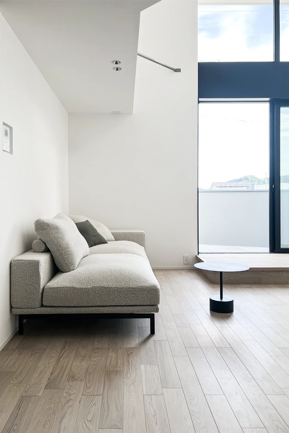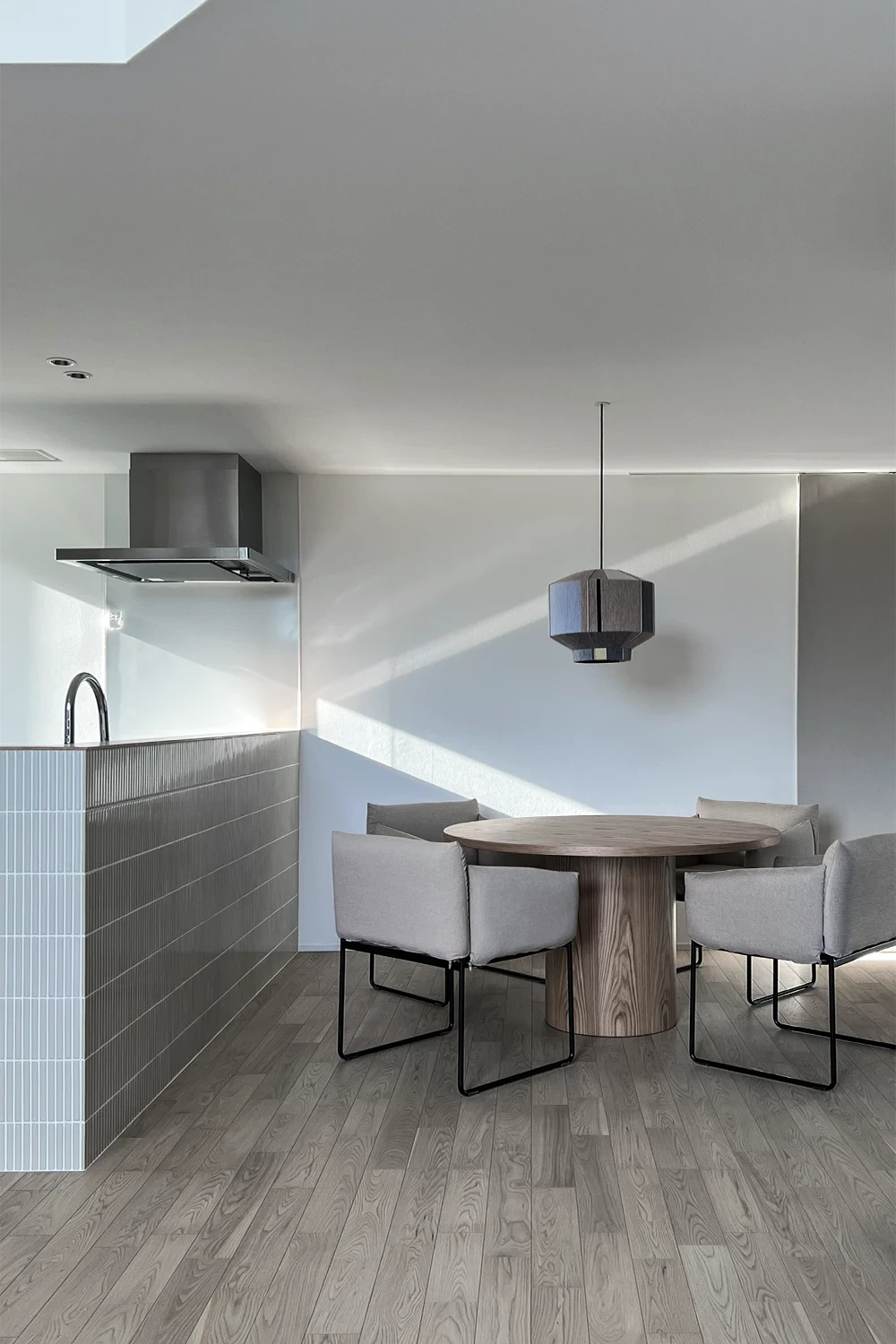 大胆な直線ラインで構成された住宅。自然光が綺麗に演出されています。内装にスチールやタイルなども使用され、エッジの効いた空間に仕上げられています。 ソファやダイニングチェアには柔らかい印象のフォルムやファブリックを採用することで、「心地よさ」というアクセントをプラスしました。