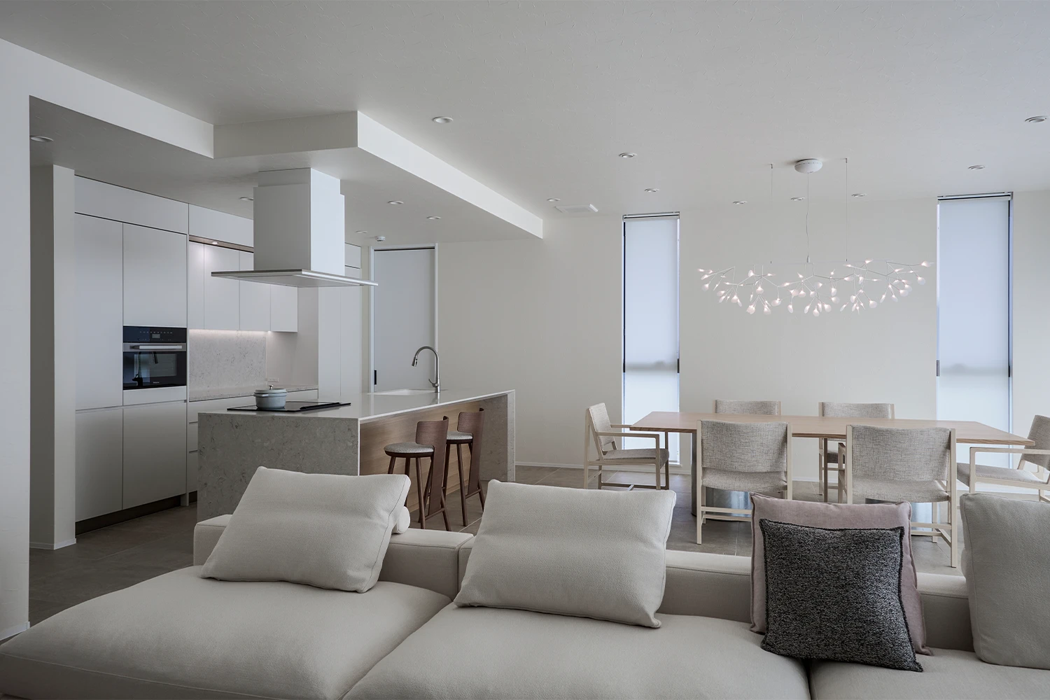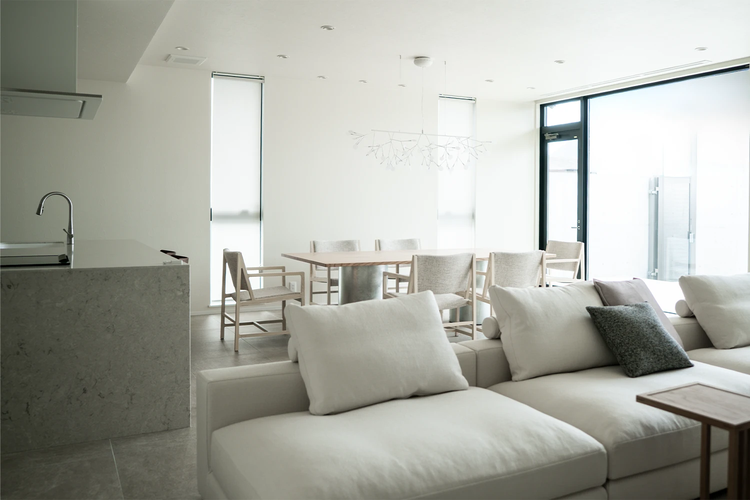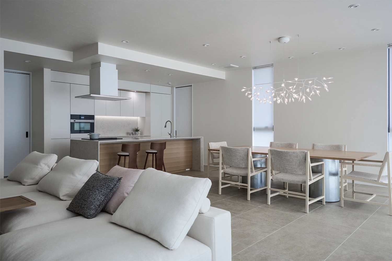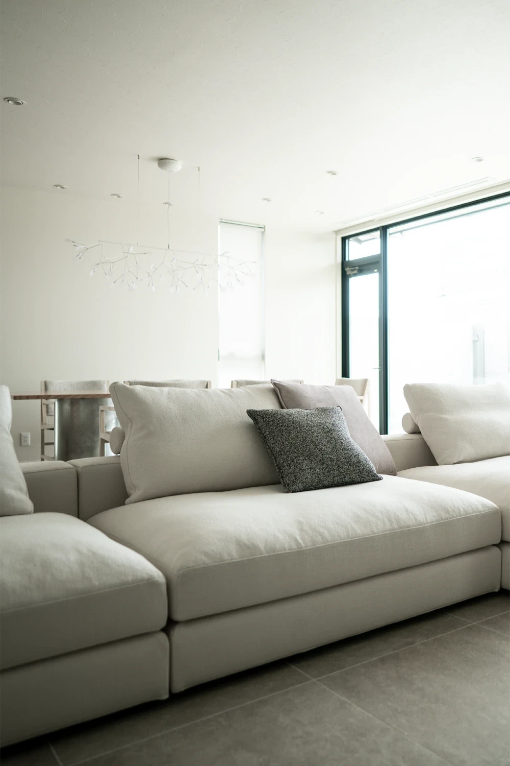 LDKからアウトドアまで広がる大空間。家具は、空間の広さに対して、そして、今後取り入れられるご予定のアイテムも考慮して適切な密度になるよう心がけてご提案しました。 内装材やキッチンの素材感と共鳴できるよう、家具にも上質な生地や素材感のあるものをご採用いただくことで、心地よく上品な空気感を纏う一室に仕上がりました。