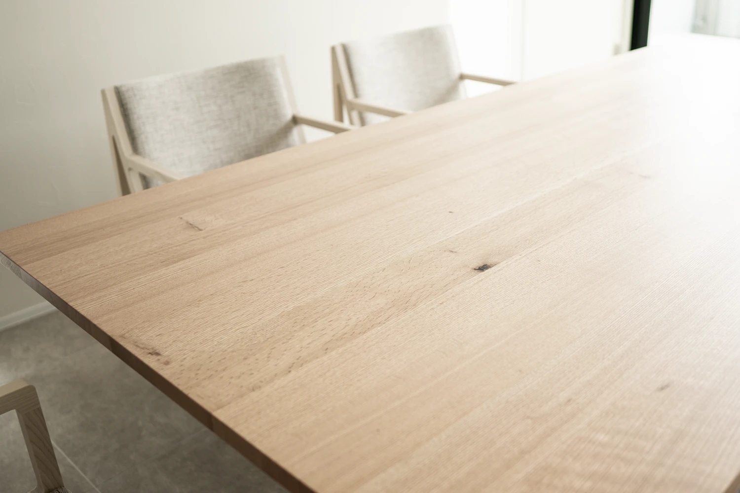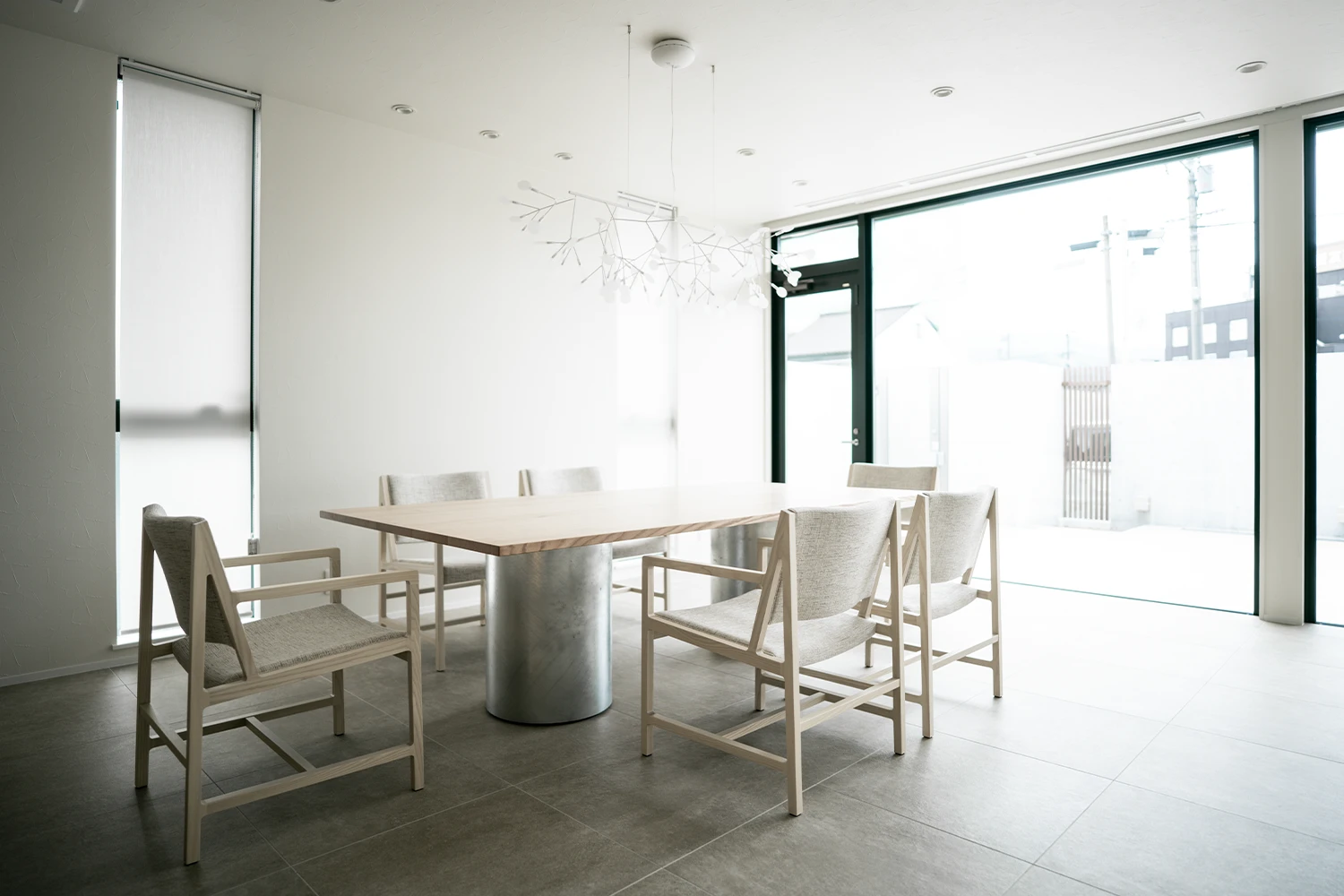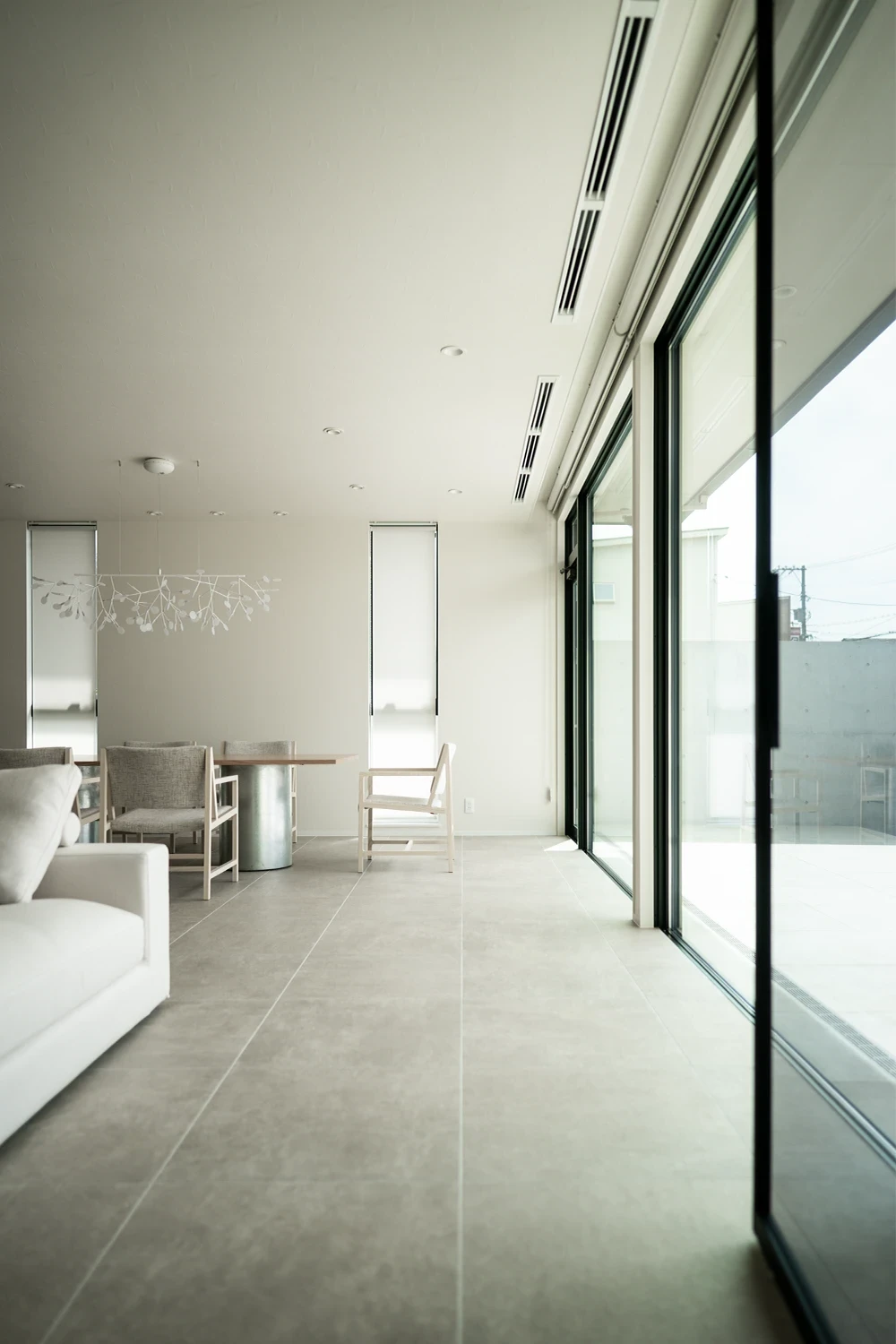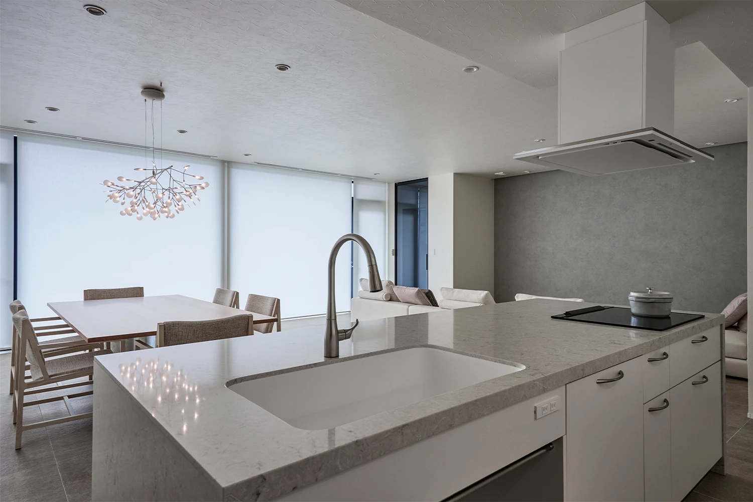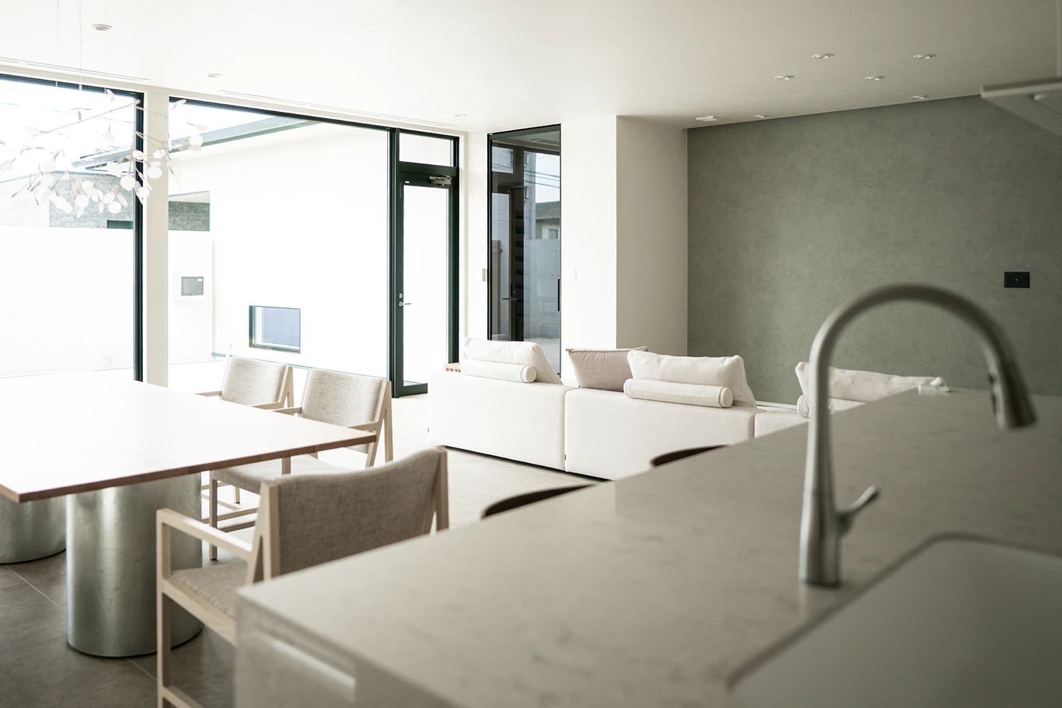 LDKからアウトドアまで広がる大空間。家具は、空間の広さに対して、そして、今後取り入れられるご予定のアイテムも考慮して適切な密度になるよう心がけてご提案しました。 内装材やキッチンの素材感と共鳴できるよう、家具にも上質な生地や素材感のあるものをご採用いただくことで、心地よく上品な空気感を纏う一室に仕上がりました。