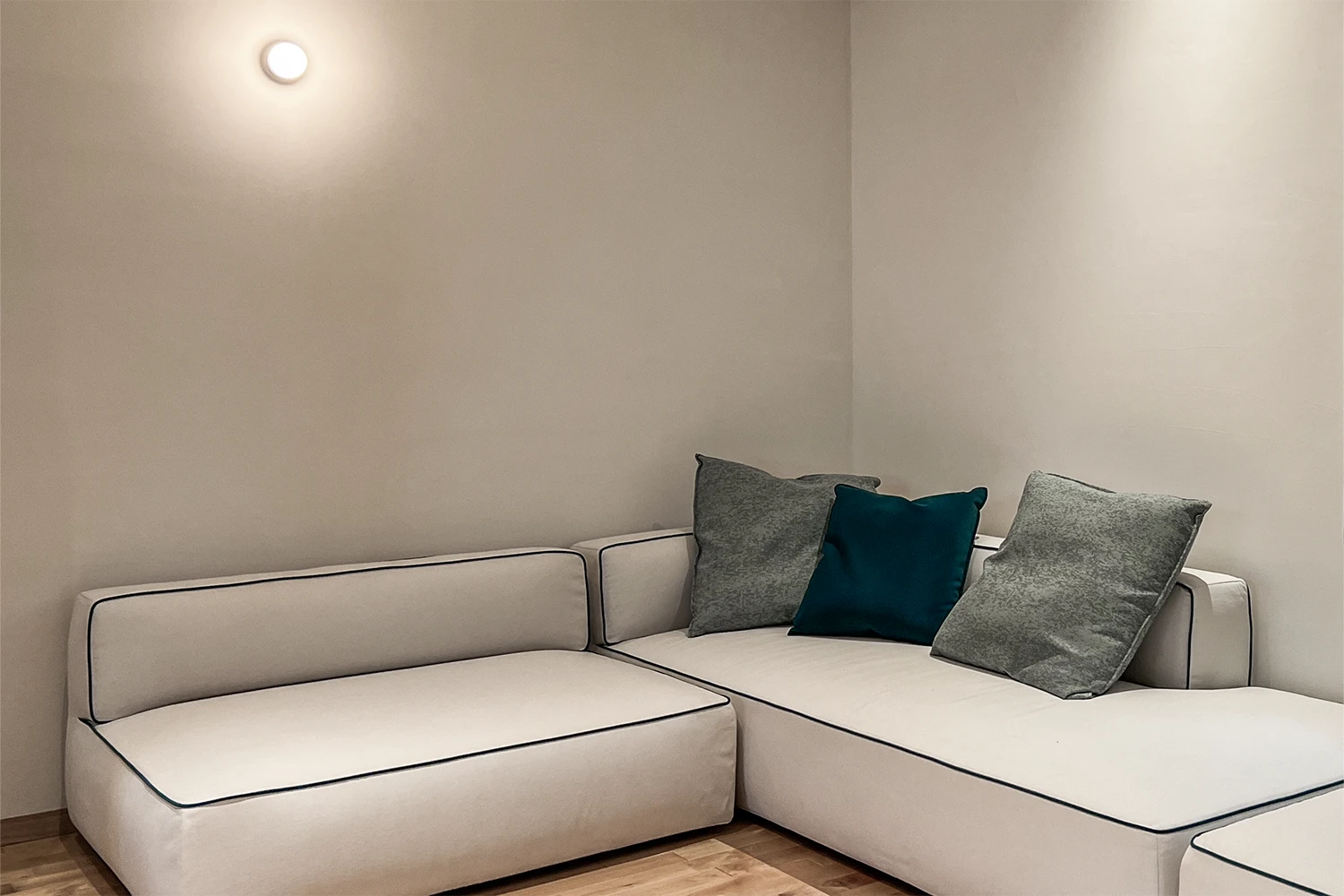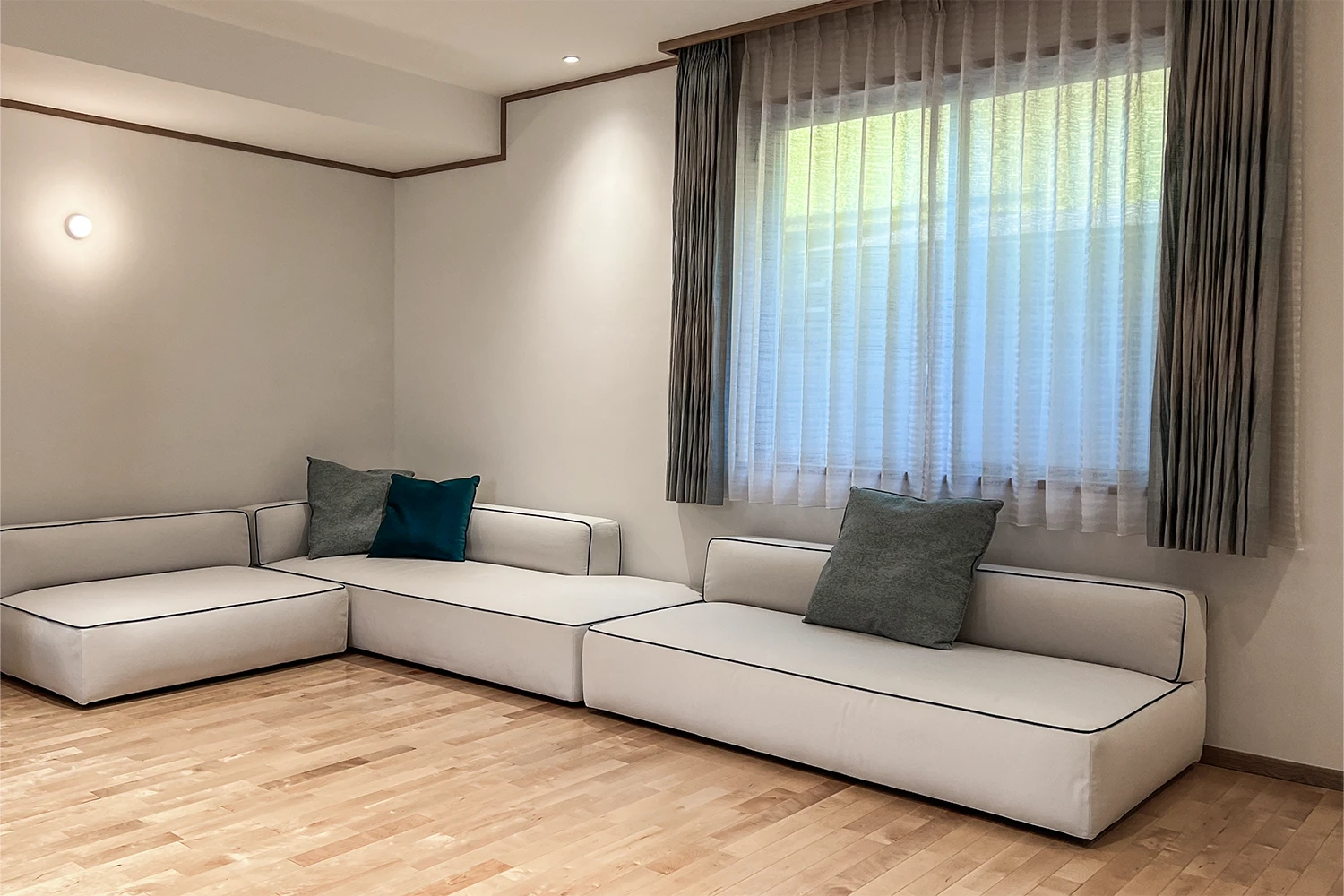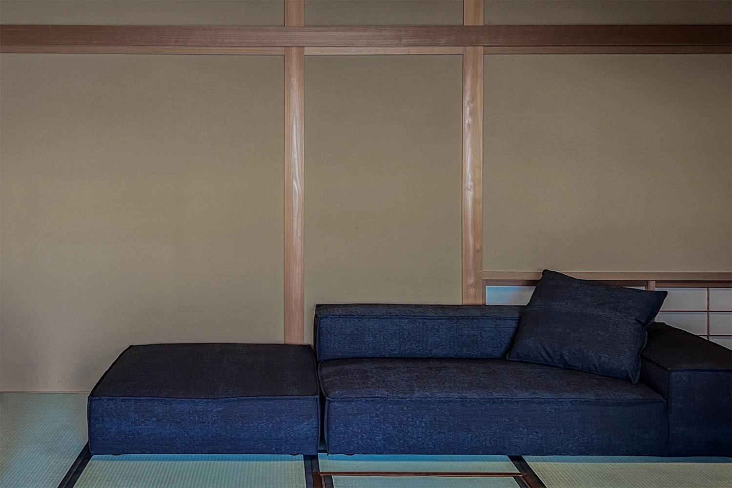 リフォームというスタイルで新たな暮らしを。洋間にはたっぷりとボリュームのある新作のGinaソファをお選びいただきました。そして、畳の間には、より低い暮らしができる定番のAmanda clubソファをご採用いただきました。