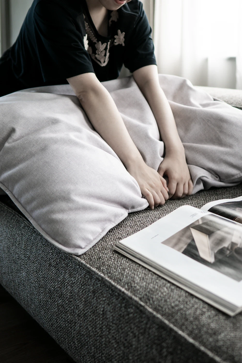 中材(コンフォート)は、特殊なスパイラル構造のポリエステル綿です。柔らかさとしなやかさを兼ね備えた優れもの。それを、絶妙な密度で詰めています。シリコンコーティング加工が施されており、ご家庭で洗濯していただけます。
